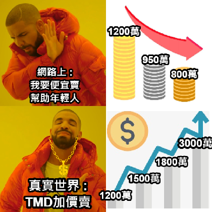 然後掛著慢慢賣,放個半年沒人要,先下架一兩個月,之後再加 500 萬上架,還是沒人要,再改回 2800 萬就可以掛個「屋主破盤殺出」之類的廣告。然後時間過了二十年了,還是掛著慢慢賣,反正沒賺就不要賣。最後就可以等到都更了。台灣傻子、瘋子和盤子都很多,慢慢賣,一定可以找到接手的。