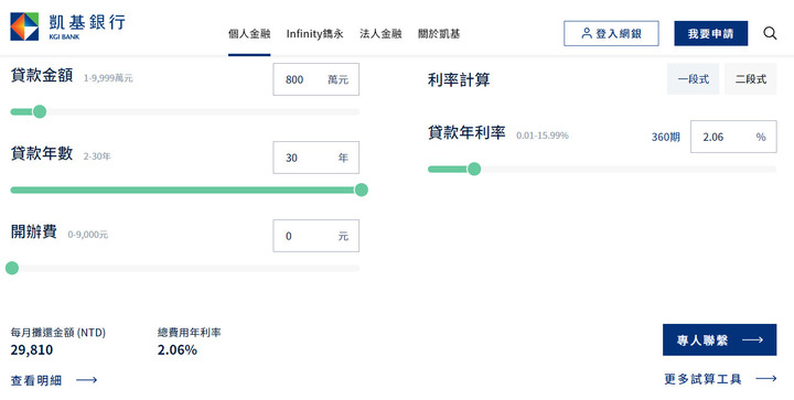 一、以凱基銀行提供試算結果,貸800萬,30年,年利率2.06%,月攤還額 29,810元 (還沒算開辦費等等)二、不動產買你的名字,但媽媽是借款人(月薪5萬),你是擔保物提供人同時為連帶保證人三、可以去各銀行試算一下貸款本息結果,直接跟銀行連絡比上來跟網友求明牌會來的明確以下以凱基銀行為例凱基銀行-貸款試算