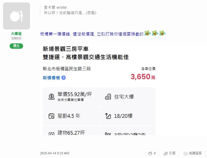 窮人都有相同的共通點就是【吃米不知米價】。還會見獵心喜推薦每坪五六十萬的甜甜價,總價為3650萬。【板橋第一環價錢】,特別強調【還沒殺價喔】。藉此物件說要【打臉耍猴戲的】?!看來應該是在自我打臉秀下限才對。窮人到底知不知道3650萬是什麼概念?3650萬的概念就是,給你年薪百萬的打工仔,36年不吃不喝也買不起。↓