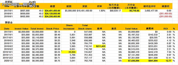 2020/1/5 更新..忽然發現買房的每月資出含利息應該是95,718, 之前只算到本金 80, 839如果租房房租40, 000, 每個月可投資金額應該是~55,000. 在此更正..[Stock]Total Invest = $6,595,000Total Value = $7,436, 894ROI = 12.77%