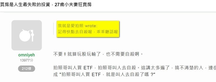 只是個過程 wrote:所以過程哥說啊,如果皰哥沒錯,那 零股哥(達克瓦 / Vincent666888) = 路人 = 西奈大 了。 塔尼哥是高雄人住台中我是台北人住新北塔尼哥是文組讀商的, 而我是理工的就算上面的都不談要讓我 = 塔尼哥起碼也要先給我一隻"榮耀手錶"吧?還有人看不懂還一直死抱著IP不放某隻鳥還傻傻地跟著上車然後一起翻車然後最好笑的是翻車了還不知道自己翻車金摳連, 金BI我就是愛拍照 wrote:看了一下小鳥的前世今生,好像以前也還蠻正常的。應該是來房版以後才性格大變的吧? 韓國有一部片子叫"寄生上流"BJ4