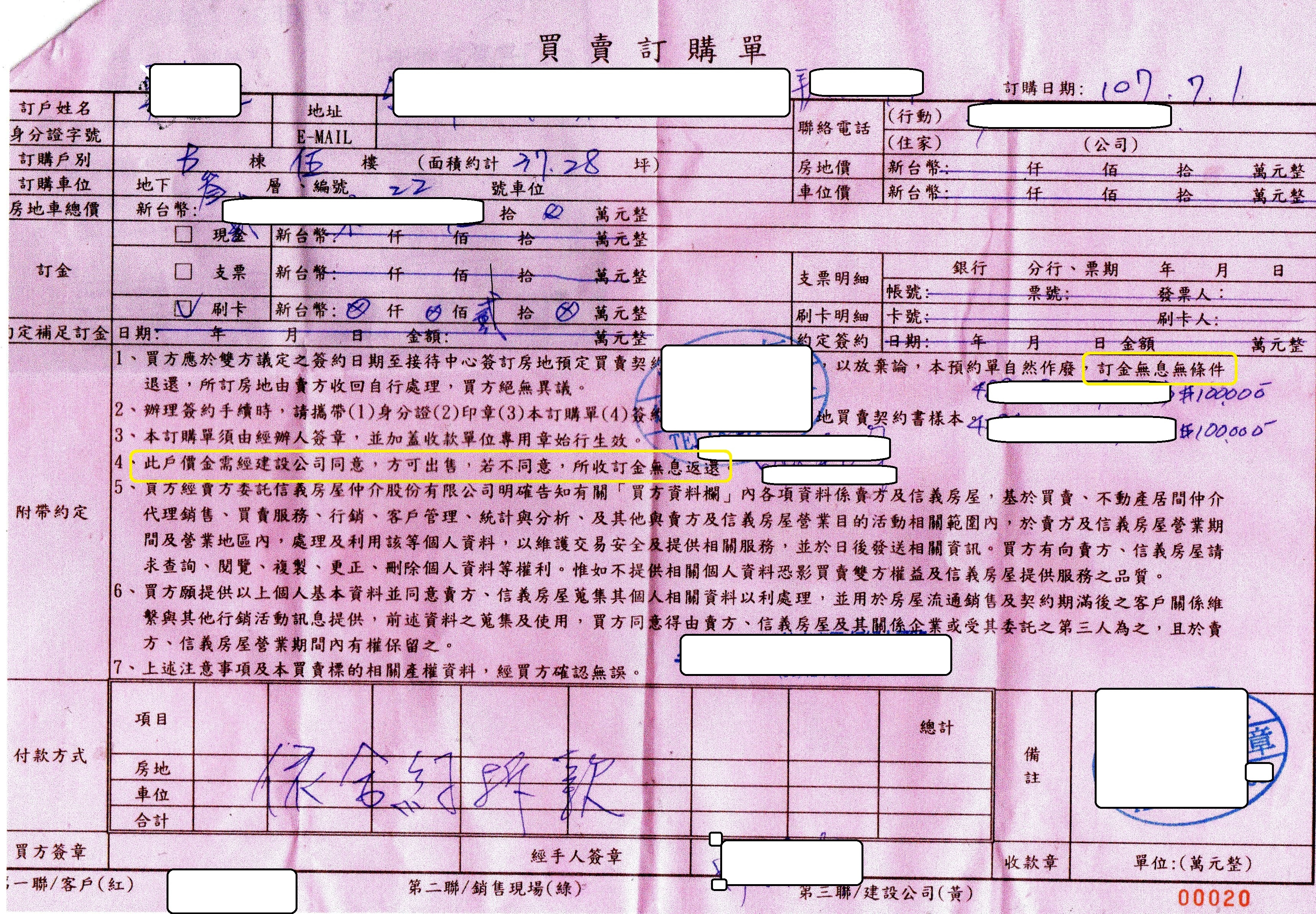 跟代銷談好價錢付了訂金, 建商第二天說不賣了.理由是這間地主戶要加買!增校A! 聽聽就好,另, 這是一張怪怪的紅單:附帶約定1: 買方若放棄, 訂金無息退還2: 價金須經建設公司同意, 若否, 訂金無息返還怪怪之處: 1: 一般紅單訂金會沒收2: 這叫斡旋不叫訂金吧, 那要代銷做甚麼? 收錢收好玩的? 這叫留個伏筆, 看誰出的價錢高, 其餘拜拜, 是吧是有這麼缺嗎? 還是房市即將反彈勁升了?這種建商, 還是低樓層, 拿去拿去我不要也罷