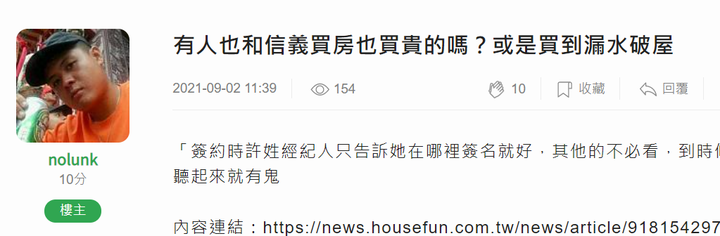 至從開始打算換屋,開始自己做功課,身邊很多朋友找房子時都發現,信義房屋的房價就是開的比別間房仲高,甚至也有遇過就類似此新聞內提到的,利用一堆爛藉口,縮短看屋時間,要求儘快付斡旋、簽約,然後買方發現屋子一堆問題時,再用合約來強逼恐嚇,可能違約,然後買家求助無門,最後就只好認賠。