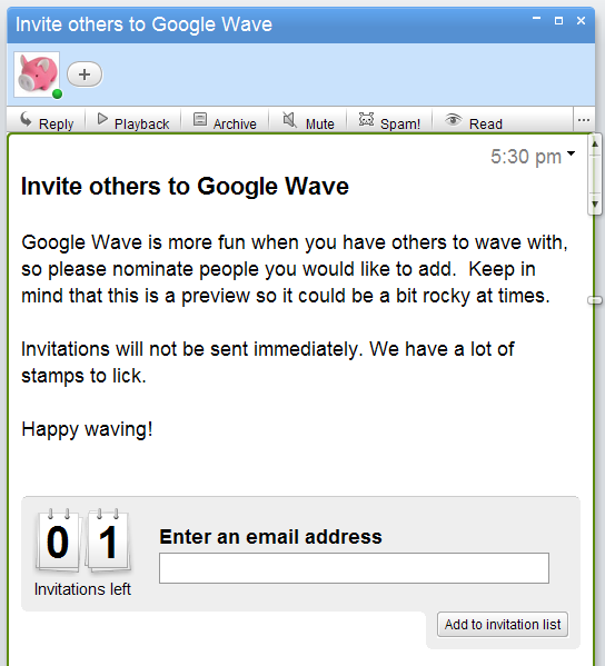 ~@@"~我也想要~不知從何排隊!?謝謝!!!剛剛去拜大神找到的中文Google Wave邀請接力大陸那邊弄的網站!!大家試試吧^0^~接力規則如果你同意加入到中文Google Wave邀請接力的隊伍中,那麼你必須遵守以下這個分享規則:如果你收到了來自Google Wave的邀請並激活,那麼你將得到新的8個Google Wave提名名額,請你將其中的4個提名名額共享給參加接力的朋友。系統會指定給你4個用戶的EMail,請大家本著互聯網分享的原則,以及誠信原則,將邀請發給這4個用戶,那麼這4個用戶又能繼續接力下去,造福更多的人。
