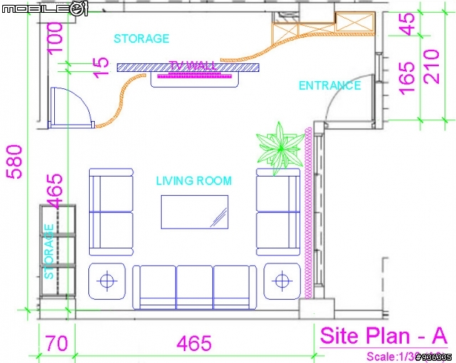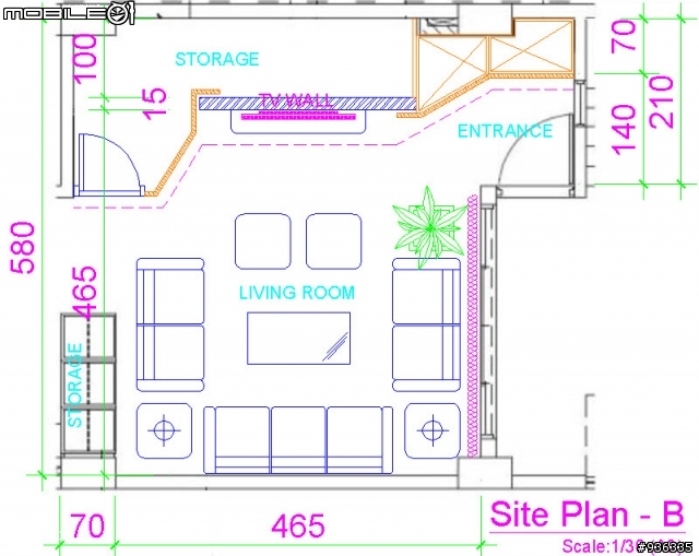 二:這是我想到的將電視牆拉往前面,作一個約150左右的石材牆面來壁掛電視。後面作隱藏式櫃體。