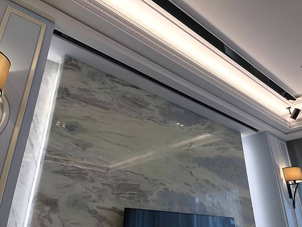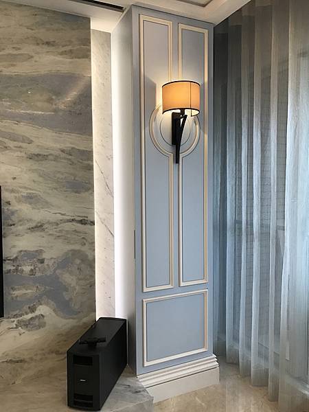 有兩個跟電視牆對稱的造型牆面+壁燈