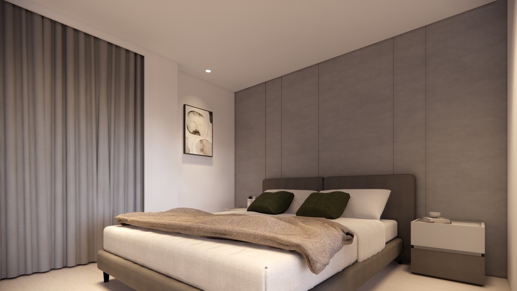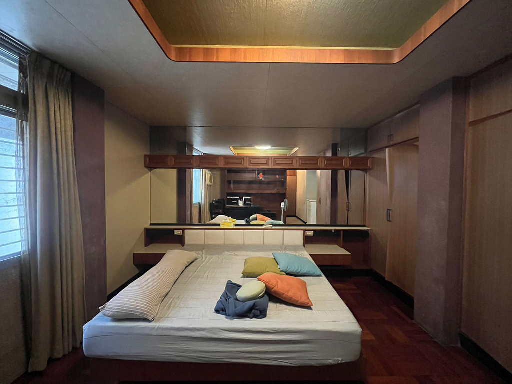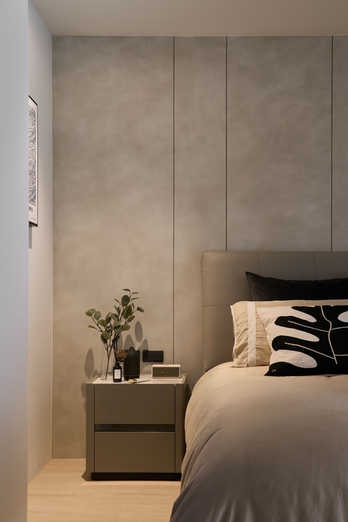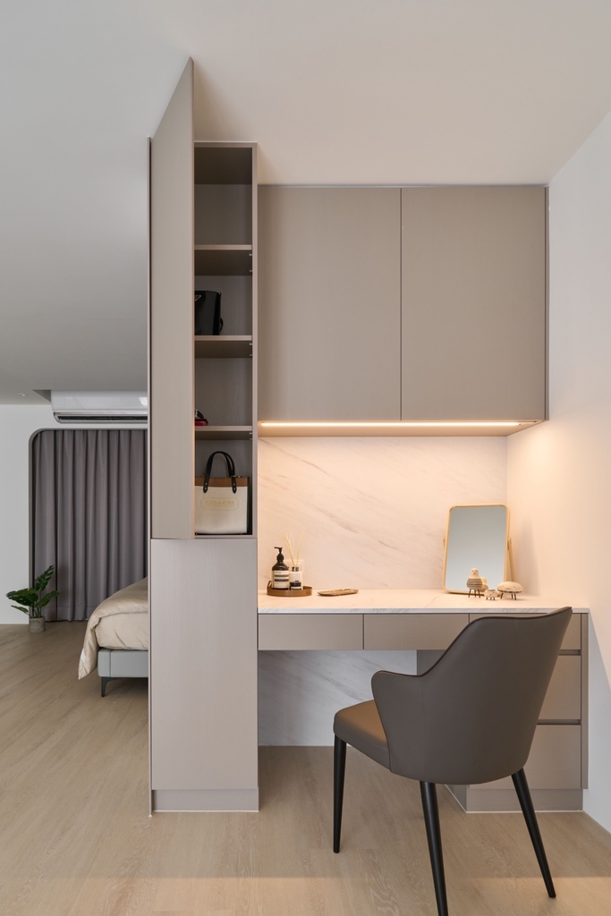 臥室是一整片大空間,以梳妝台區分兩個空間,外面可以當較為隱秘的起居室,裡面則是睡覺空間。