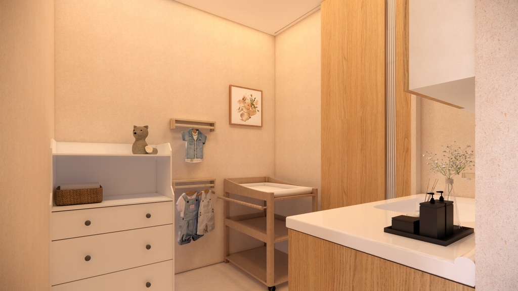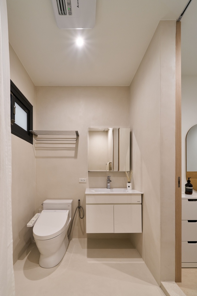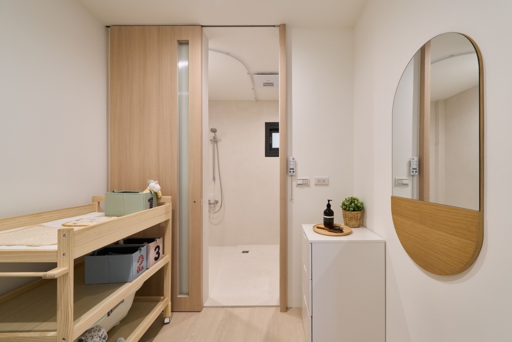 主臥浴室簡約設計,比較特別是外面的小空間,設計師規劃成育嬰空間,因為嬰兒前期很常需要更換尿布及清洗,因此離水源越近會越方便,這區規劃了尿布台、收納櫃以及牆面掛鏡,洗完澡也可以在這裡吹頭髮,動線很方便。