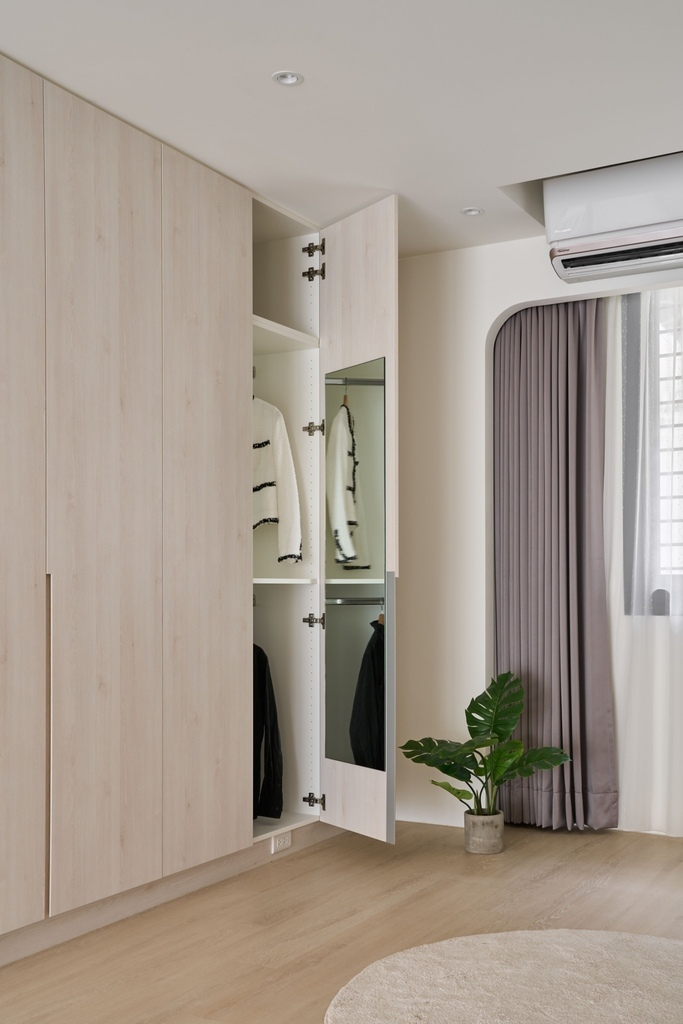 ▼全身鏡放衣櫃內,避免未來寶寶會爬會走碰撞到鏡子,大空間盡量淨空為主。