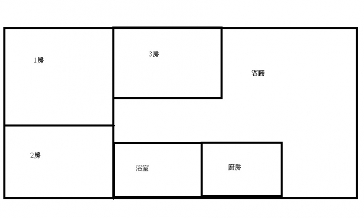 不知道你的預算多少,可是我也覺得房間不用夠大,能睡覺就好了!如果是我~不改大門的話,我會想改成下圖這樣,請看配置就好,比例在於你個人了!隨便用小畫家畫的廚房可考慮做開放式的,也能跟家人互動,但因為房子小~所以飯廳和客廳就合為一了!(不然規劃在廚房旁邊擺個餐桌也可以!)浴室放在這個位置是覺得房間出來都可就近上廁所,人有三急啊!