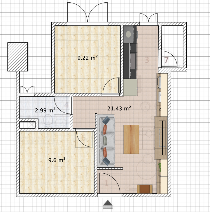 不要餐桌與客廳桌,放一個移動式客餐桌(藍色)空間不夠就捨棄一些不是長時間用的地方你的餐桌到做後一定會變成雜物推置區客廳桌用活動式放在原餐桌位置,要吃東西在推出來。門進來做一個到天花頂的淺櫃,可以放進出門的隨身物品,也有一個落塵區淺綠色處就可以下方做鞋櫃,上方做玻璃展示櫃。不要在靠進主臥門那做屏風,這樣坐在沙發上會覺得整間屋子很壓迫你的冰箱那可以做一道上下清玻璃中間毛玻璃+玻璃滑門,檔冰箱也檔料理油煙不會散到客廳與主臥來,但不會影響採光。