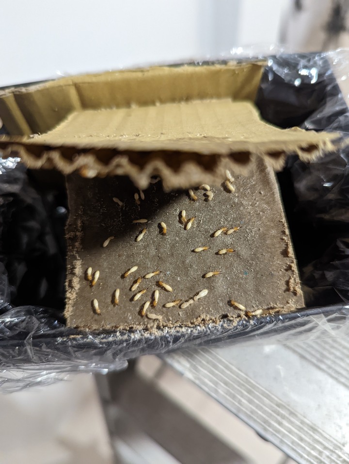 經過幾周,因為我沒把觀察箱移除,剛又在原地方發現蟻道好像又補起來,稍微撥一下,真的有白蟻出現,看來又得重新來過