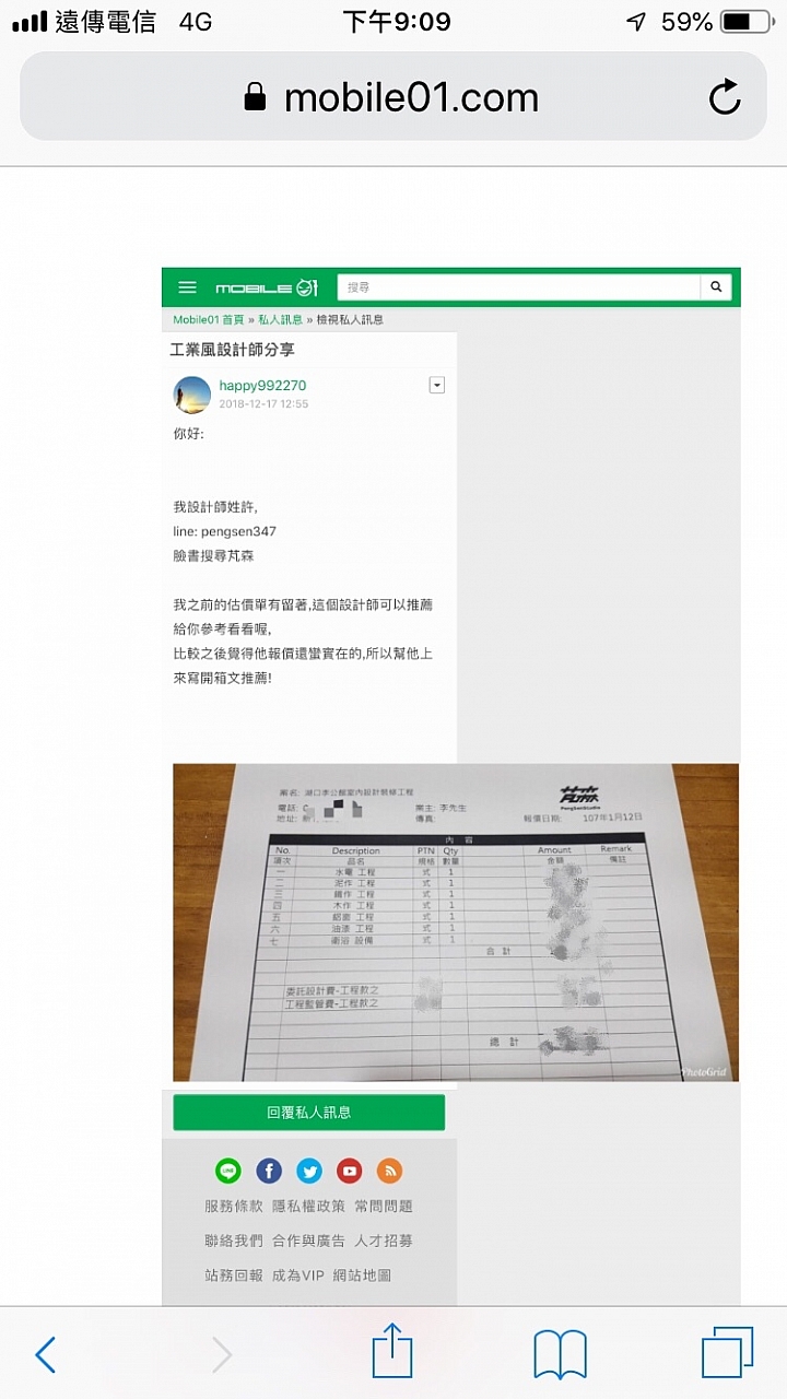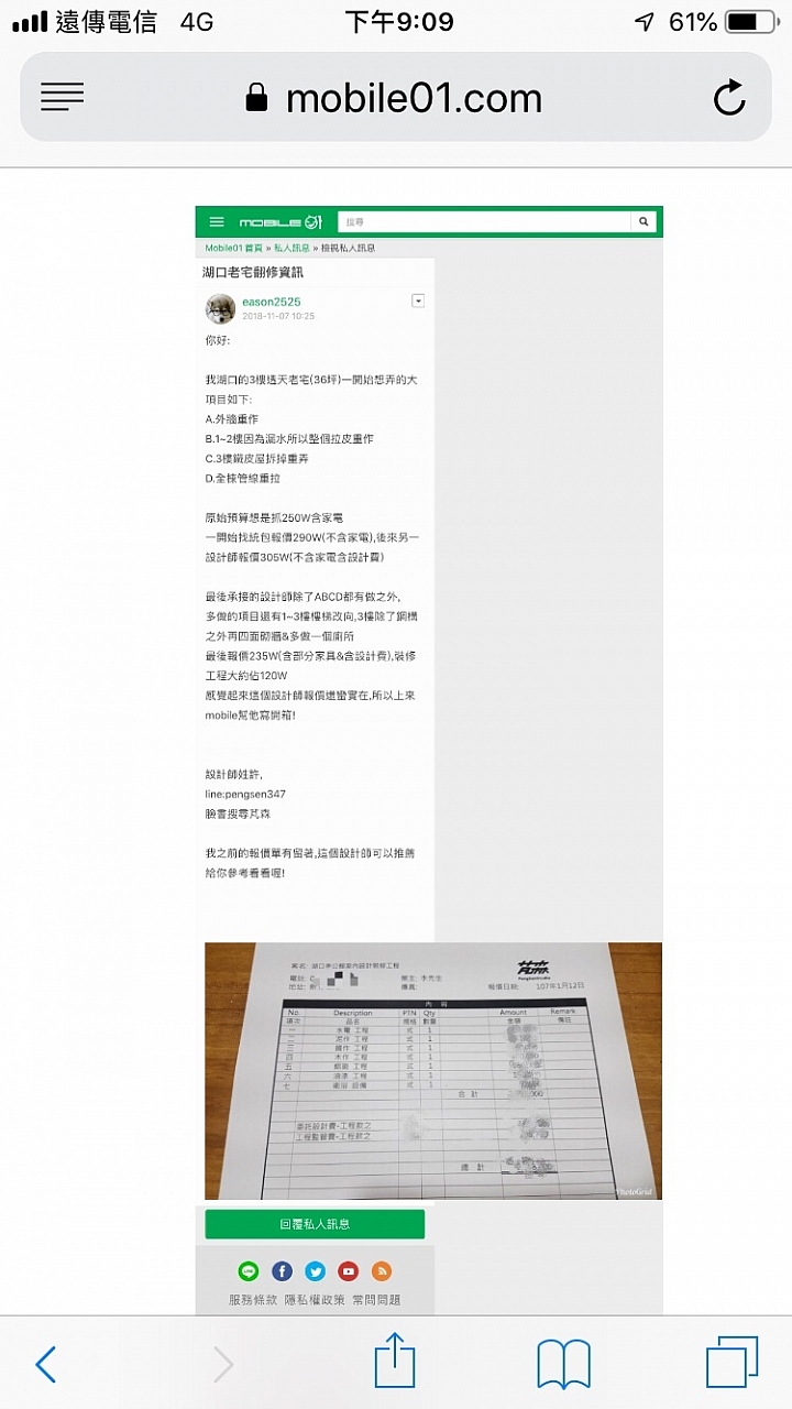 謝謝您的報價單分享,不過報價單施工地點怎麼跟您po的分享有些出入??您的裝潢建案不是在青埔嗎?為何跟這位01網友報價單是一樣的?【開箱文】35年透天老宅翻新改造-日式簡約-引光入宅http://www.mobile01.com/topicdetail.php?f=360&t=5487112該不會是斜手....?