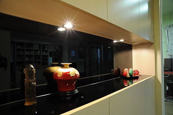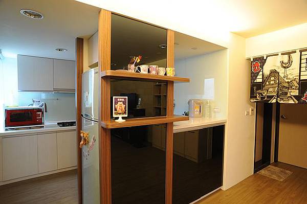吧台檯面可當小電器櫃,平常不太用的小電器可暫時收進那凹洞裡,除了通往後