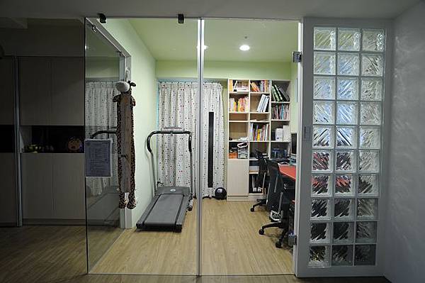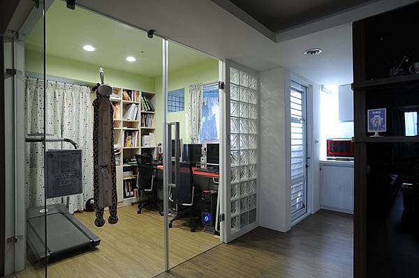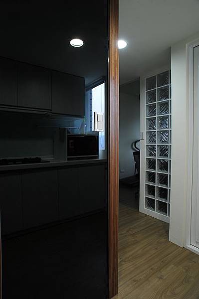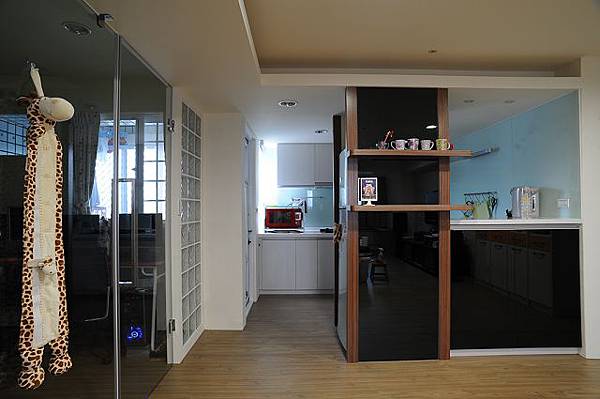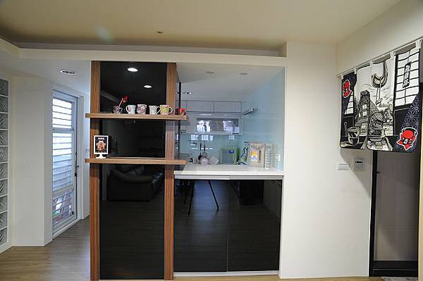房),所以設計師以拉門來破二扇門的說法,上下是系統櫃的門片,中間是噴砂