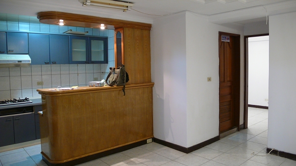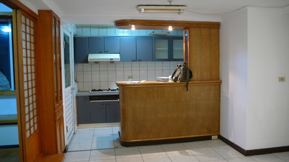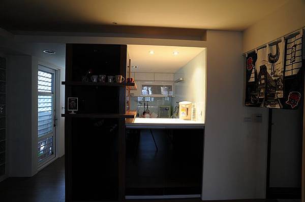 這是從廚房望向客廳跟走道的角度,這吧台樣式老氣,功能性還不錯,只是我們