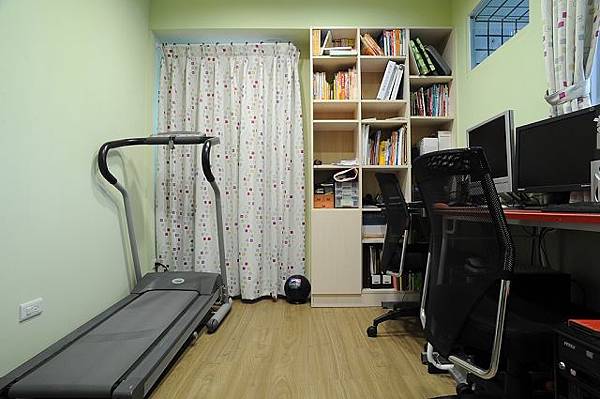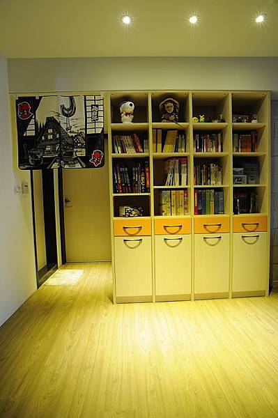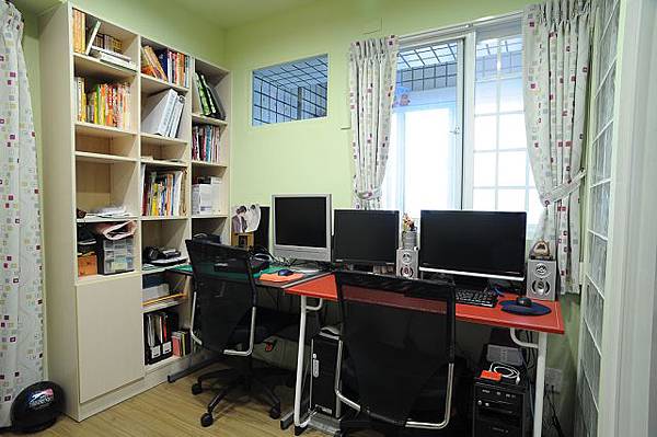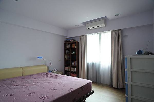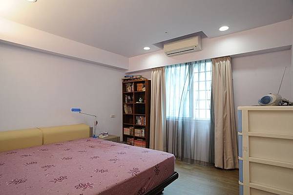 這是主臥房,窗邊放置漫畫小說的書櫃,跟右邊的整理櫃是從舊家搬來了,這面是