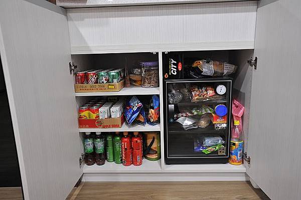 非常重要的地震逃生地點:零食飲料櫃,右邊的防潮箱能確保我們吃到的餅乾,