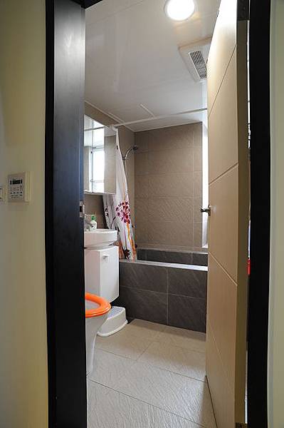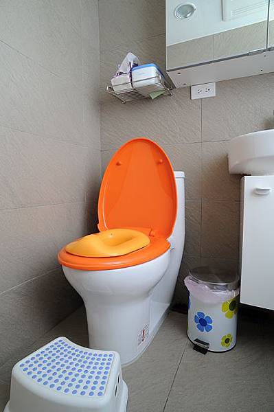 馬桶蓋選了一個非常跳色的橘,連帶小薇的小馬桶跟著配合,垃圾桶也跟著浴簾
