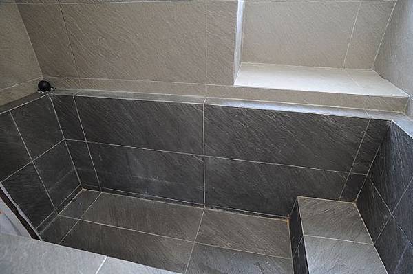 泥作砌的浴池,貼上板岩好清理,不過浴池太大了,水龍頭水流太小,還沒放滿