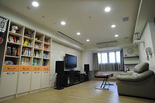 電視或布幕上,電視櫃是從舊家搬來的,雖然風格不太合,但在我們對電視櫃的