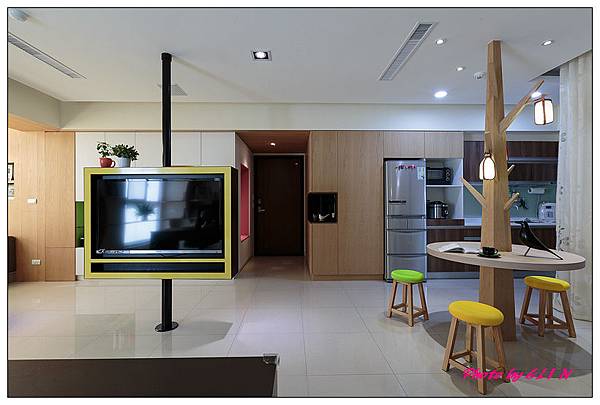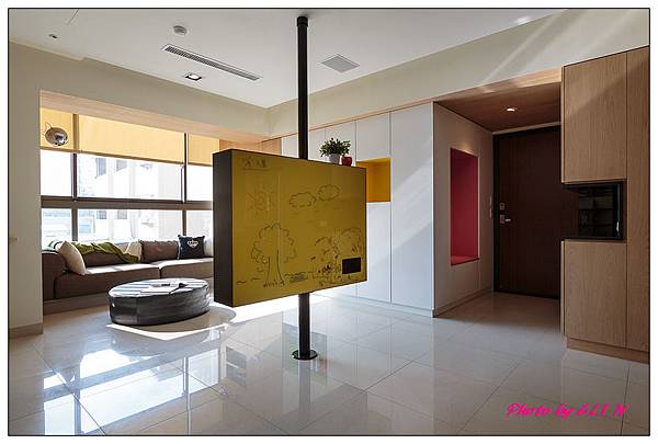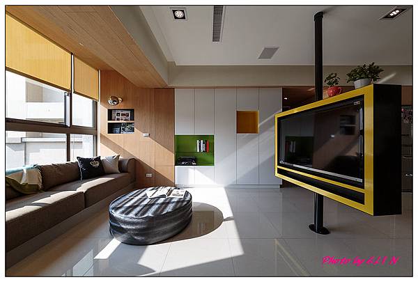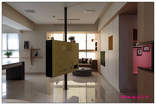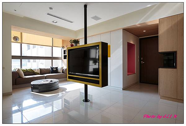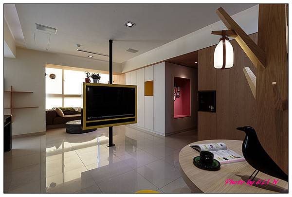 但後來因空間視覺的關係就把電視設計成180度可轉的...沙發.書房.餐廳皆可觀賞...
