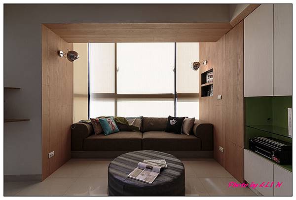 在國內應該很少看到沙發靠在客廳的落地窗...做此決定也是相當大膽...且本來材質要選擇皮革...但因考慮到陽光直射的關係後來選擇布的...
