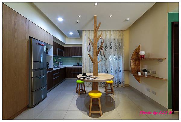 餐廳...把餐桌做成一顆樹...上面吊著三十幾隻會發光的螢火蟲....椅子搭配有情門的圓凳...且特別選綠色和黃色來搭配...