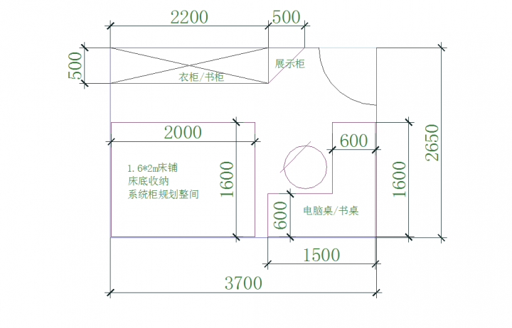 格局二在窗前增加大面積的書桌,左上角可以設計矮櫃增加收納,不過因為增加了書桌,床邊走道只好縮減到50公分寬