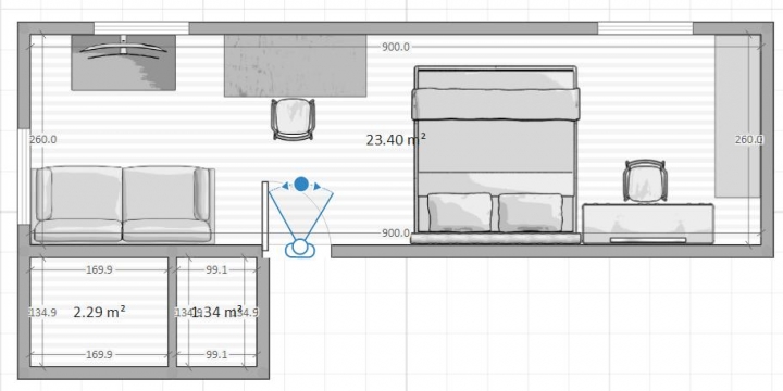 我的房間...跟你的差不多..只是你的窗戶..跟我不同我的擺設..沙發區跟你一樣..床鋪的話..我跟你不同我先提供..我自己的擺放方式..因為沒時間畫圖..就先打字敘述1.右邊上面的牆壁..垂直的擺上衣櫃..約160cm的櫃子2.右邊下面..平行擺上化妝台..抽屜靠右側..鏡子靠左側(方便坐椅子)..3.床擺在化妝檯旁邊..床有床頭櫃..方便下床..床頭櫃代表貴人..因為我房間長度大約7.5M只夠擺單個4.門進來的正前面..擺書桌或電腦桌..接下來依我的擺設方式..給你的建議1.如果會約朋友來家裡坐..是否真會在意床給朋友看到?...因為如果需要隱私的話..你的衣櫃需靠在門那邊了..缺點會是..你房間看起來變小了..然後就是吹冷氣的問題..2.你的書桌應有空間放置在門右側...3.你的寬度260cm..如果擺下一張床210cm...床尾剩下45cm可以走動..算是及格..看你是否採納我的擺設方式可以的話...你自己畫畫...或是再詢問..我再簡單的畫一下或者拍照給你看現況....給你參考
