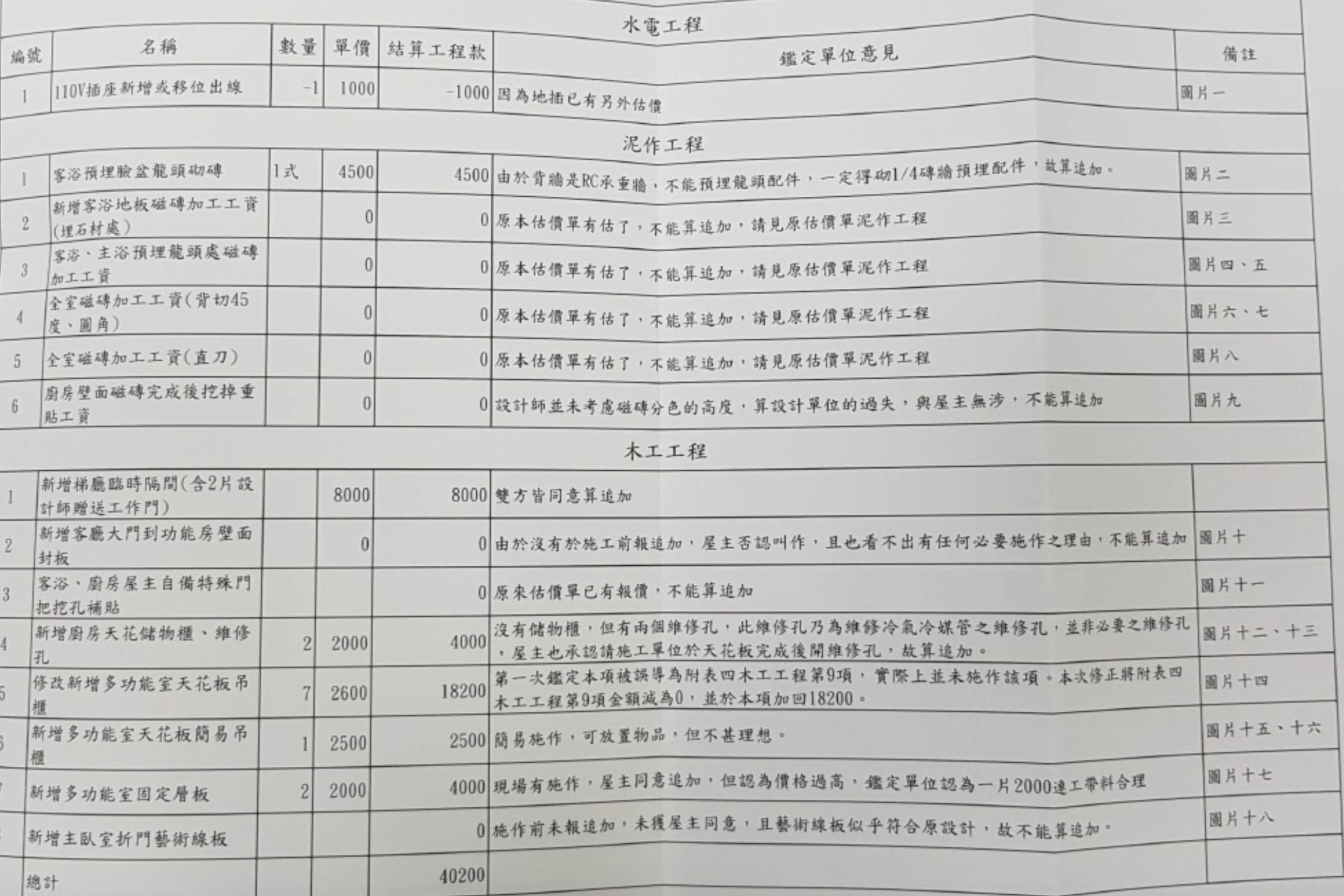(點圖可放大)最後鑑定單位鑑下來的金額,看起來已經跟設計公司所謂的「追加」金額有一大段落差但其實價格還是有被拉高的地方,例如維修孔一個要價2000我覺得非常貴,另外包含木工工程第5項鑑定單位自己承認被設計公司誤導多計算了一筆等等......其他的部分多少也有些問題這邊就先不再細談,我要說的是能夠有這樣的結果也不是隨便得來的,設計公司跟鑑定單位都不是吃素的,首先你必須在鑑定當下對於施工的邏輯與工法能夠講得過設計公司同時還要說服鑑定單位,這簡單嗎?我覺得不容易喔,其次就是這一路裝潢以來你搜集的證據或施工照夠多嗎?有辦法令鑑定單位或設計公司無法反駁嗎?打開我的電腦裡有上千張的施工照,每一天都有紀錄而且當時在施工現場待的時間都至少半天以上,所以對於狀況我很了解,可是這只是一種極端的案例,朝九晚五工作的情況下有辦法這樣做嗎?