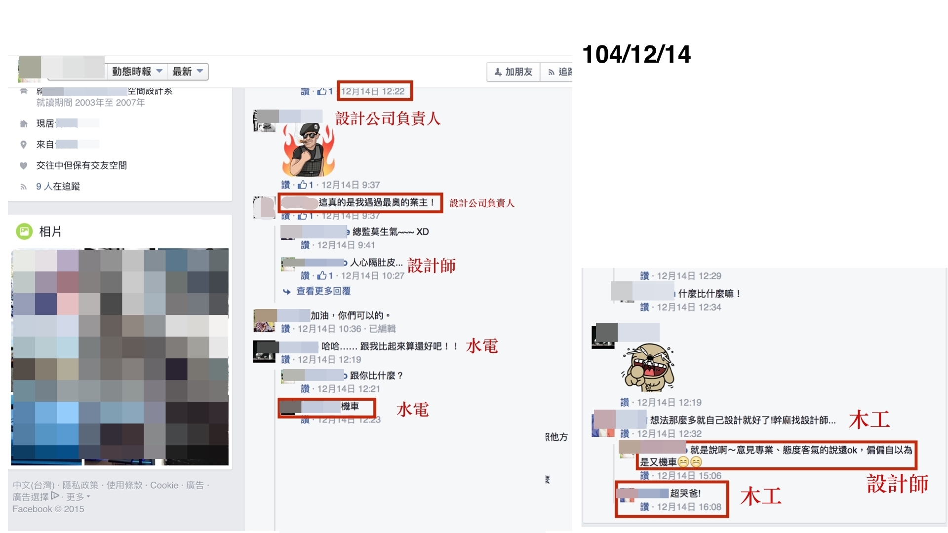 在與設計公司之間還有很多懸而未決的瑕疵修繕之時,無意中看到設計公司在臉書的公開頁面討論我們這個工地