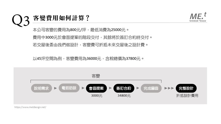 版大您好,您的時間有點趕喔,以我們公司的客邊服務流程,4次會議(包含陪同與建開會),頻率約每周一次,所以整個服務流程,也約一個月的時間。估建議您若需要設計師協助,應盡快主動面試多間設計師。不然時間其實有點趕,以下是我們公司服務流程與收費,供您參考。(官方LINEID:@093eeqwm)(官網:www.metdesign.net)(IG作品集:https://www.instagram.com/me.t_design/)