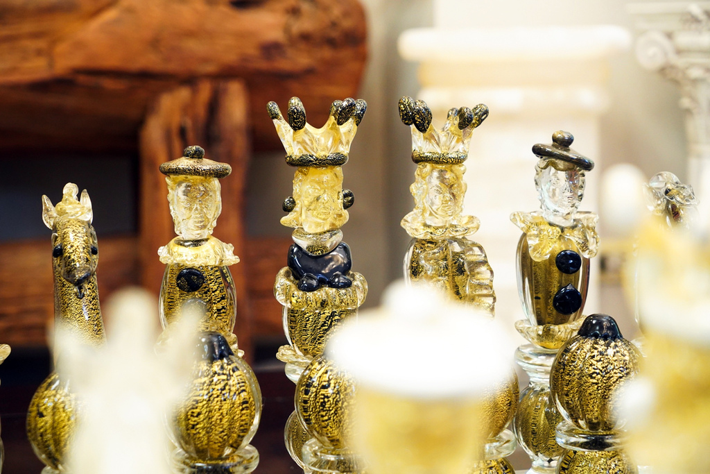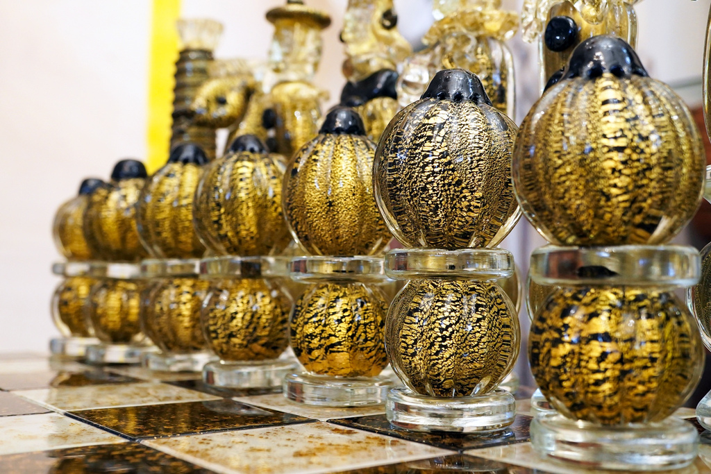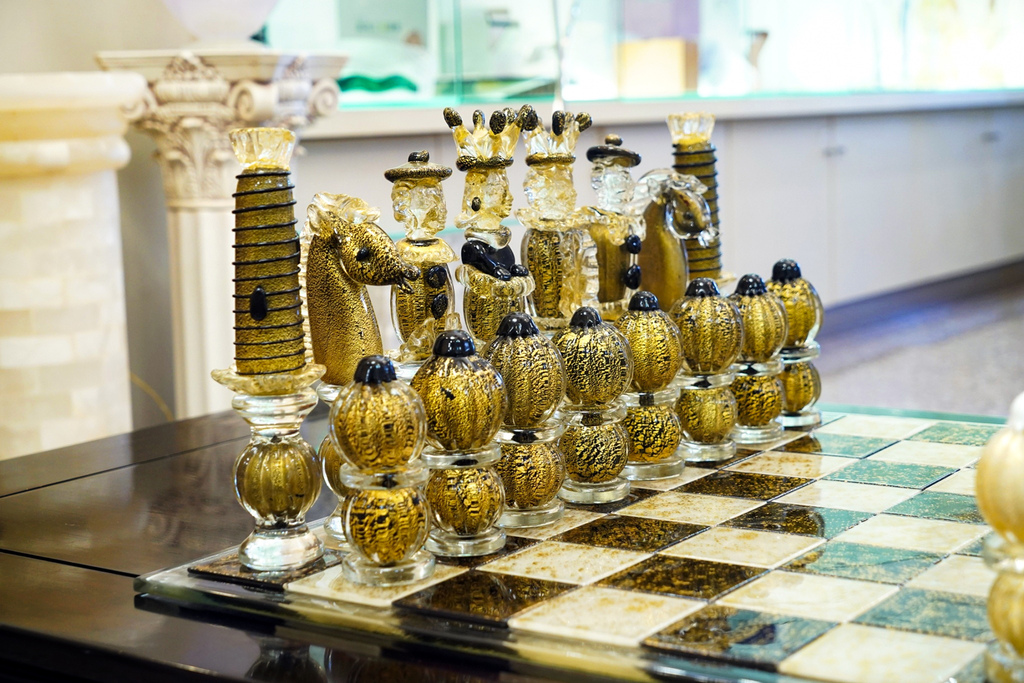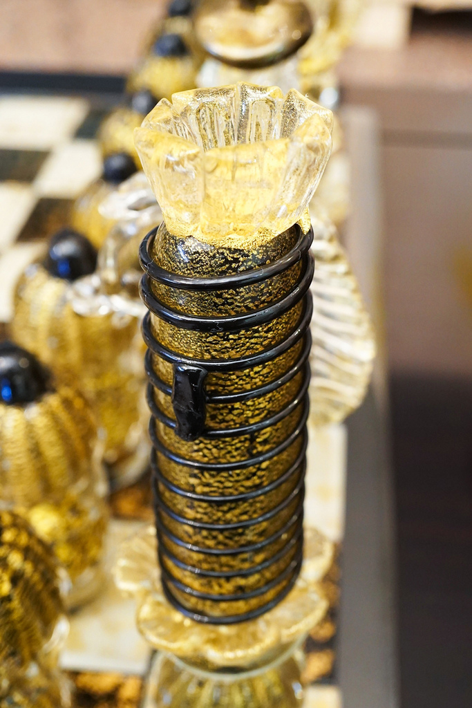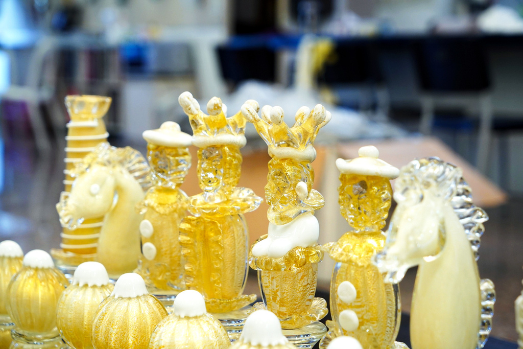 ▼棋盤工法非常複雜、費工,手拉式玻璃棋盤,底部是一層厚玻璃,黑白色棋格加入金箔,用1400度高溫燒製,成型後再一塊一塊手工鑲嵌上去