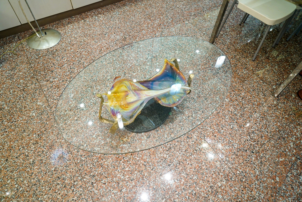 ▼四種元素分別是:大理石底座、金屬骨架、手拉式玻璃鬼蝠魟、橢圓形透明玻璃桌面