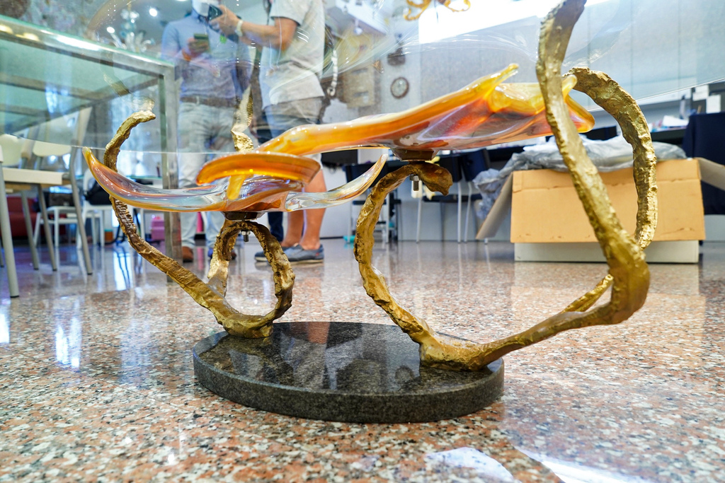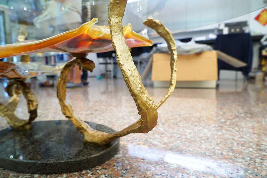 ▼一般來說台灣常見的都是木頭茶几,而這座鬼蝠魟茶几非常獨具匠心,運用四種元素組合成這座既是實用的茶几,也是具收藏價值的藝術品