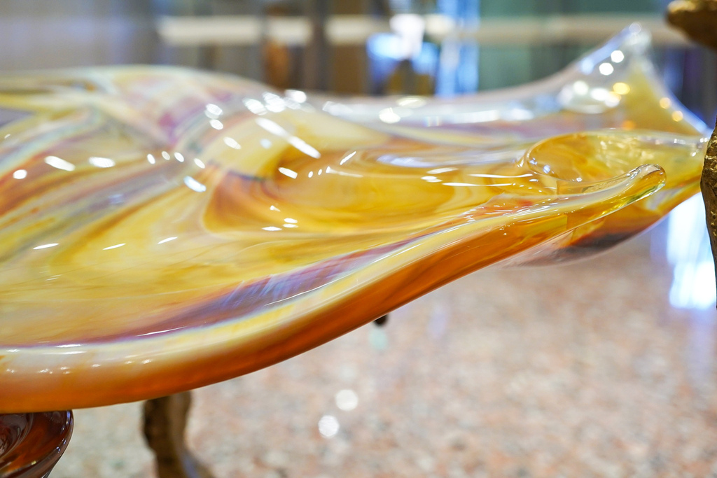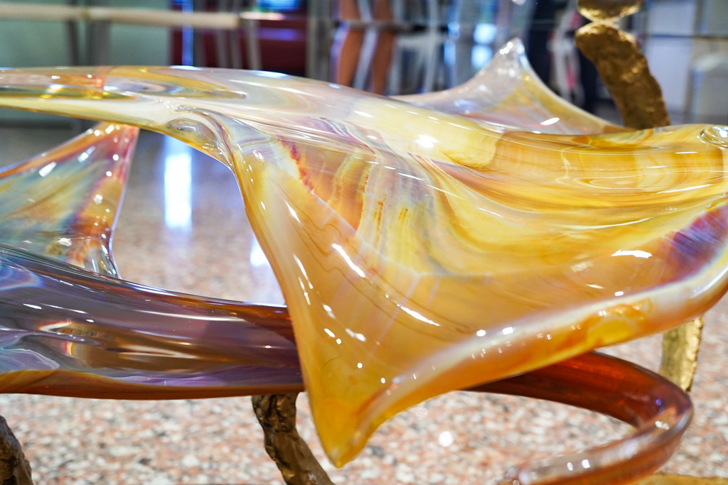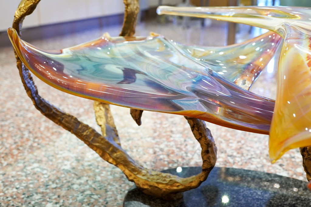▼兩隻鬼蝠魟生動靈活、亮麗柔軟,玻璃拉色線條流暢,有如一層層海浪的浪花,將海洋生物與大海的變化多端完美結合,展現海洋意象