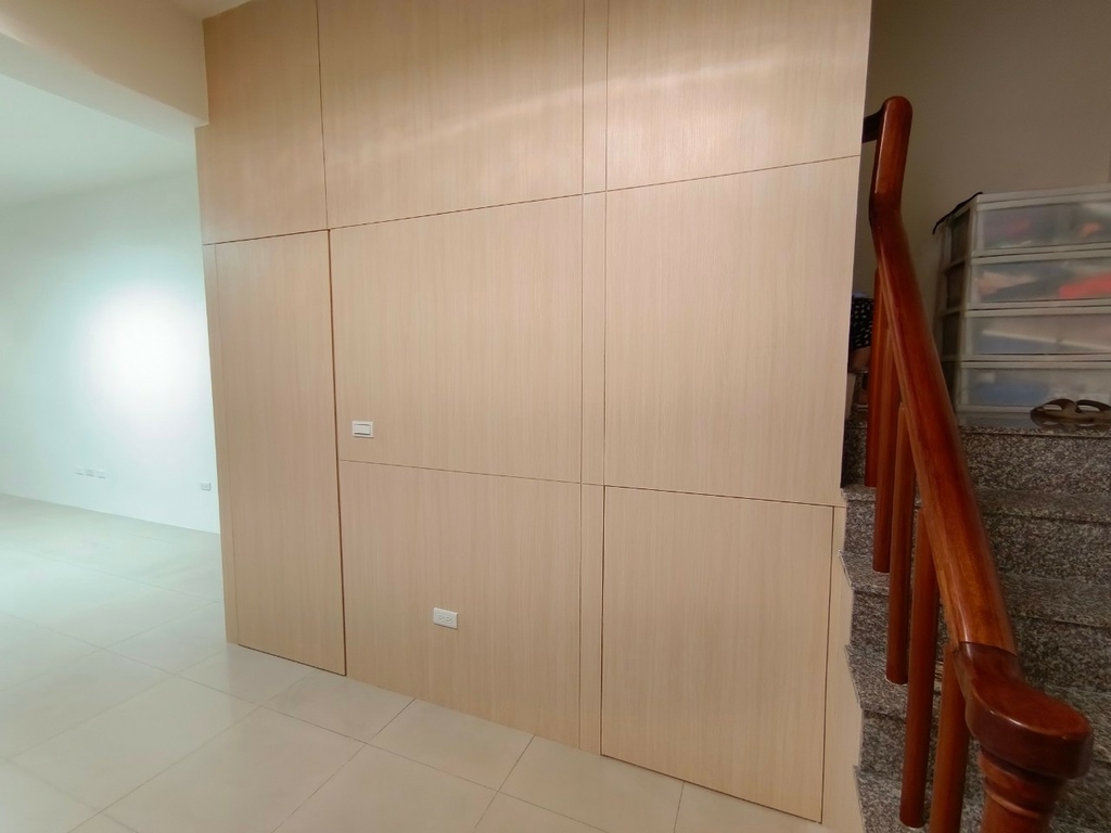 車庫階梯上掀收納櫃/一樓玄關開放櫃/一樓客廳收納臥榻/一樓客廳電視旁收納櫃體/三樓主臥床頭收納櫃/三樓主臥衣櫃/三樓主臥書桌