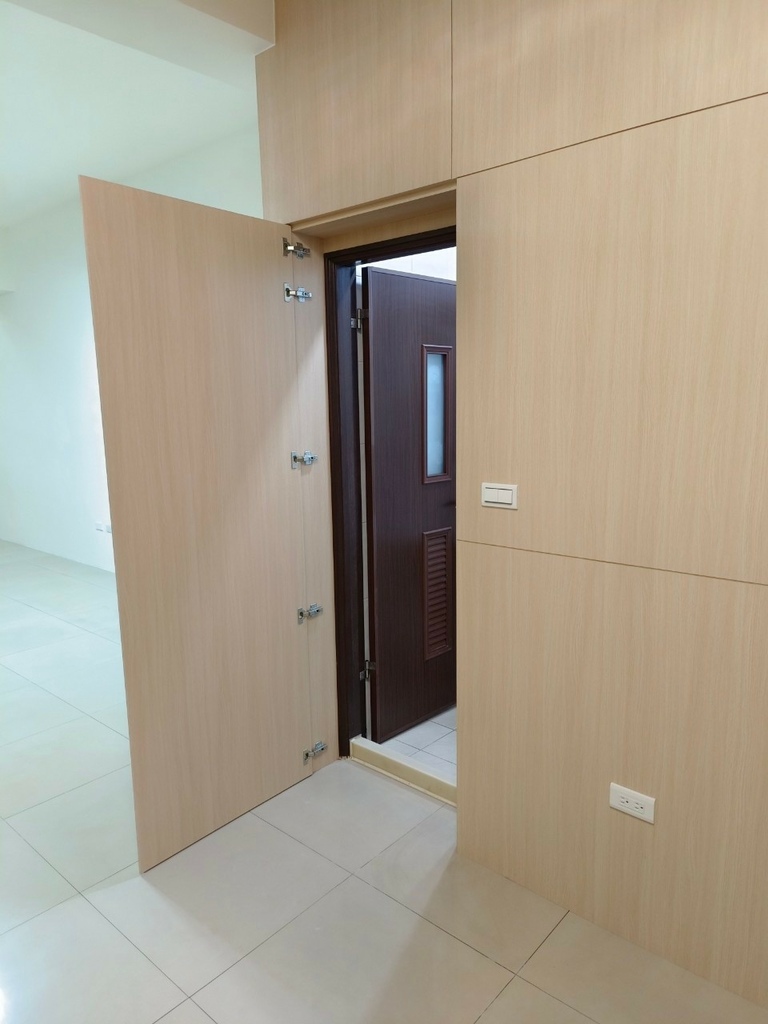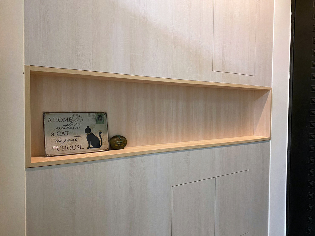 ▼玄關牆面,可以遮蔽電箱,中間的開放格可以放物品。