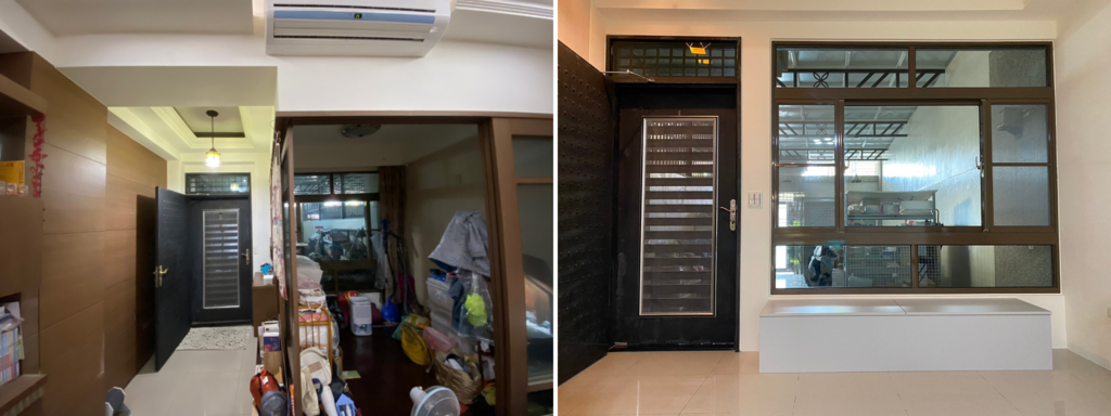▼客廳小隔間拆掉後,外面陽光透進來,房子變得明亮,我們住起來心情也很好。玄關的穿鞋椅,打開蓋子就是滿滿的收納空間。