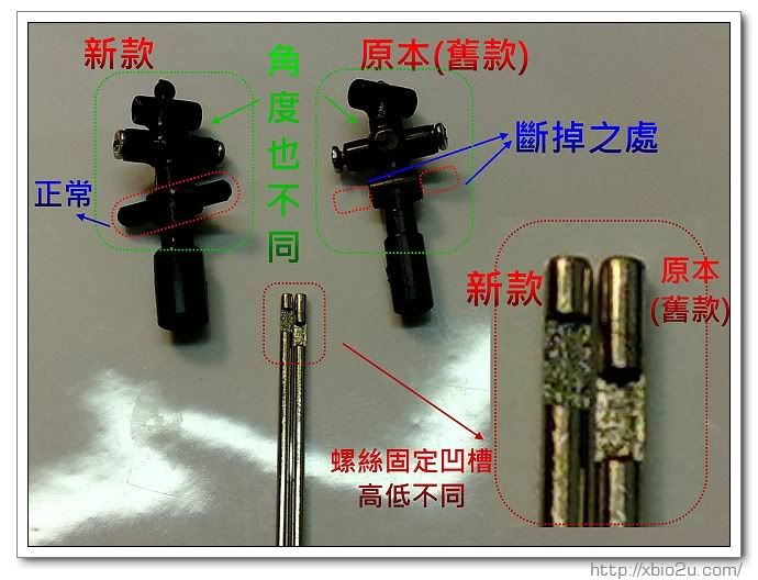 補上修復比較圖~原來原廠代理商也還沒發現這中柱以及上T型架的差別~^^所以不能只更換T型架~ 而需要將整支中柱都更換~不然會鎖不緊~造成打轉的現象~~只是換中柱~要將機體拆解~~ 但不會太難~~唯獨~原本中柱下方有個齒輪~~要將其很用力的拔起~換到新的中柱上~~XD之後~~就回復生機啦!! 繼續去翱翔~~ ^___^
