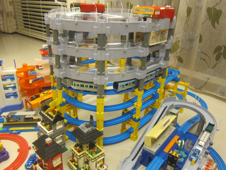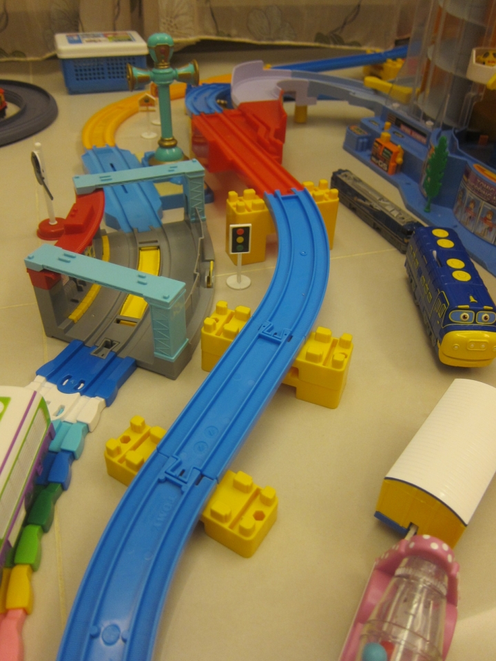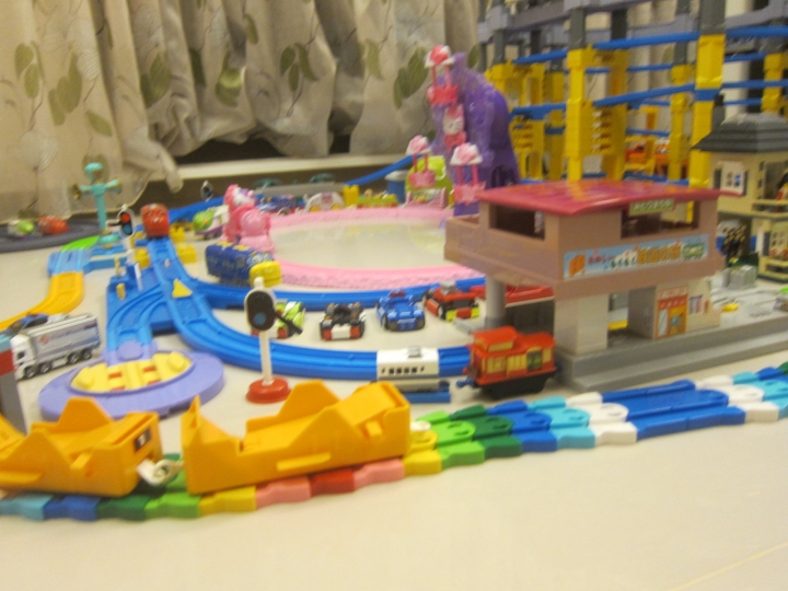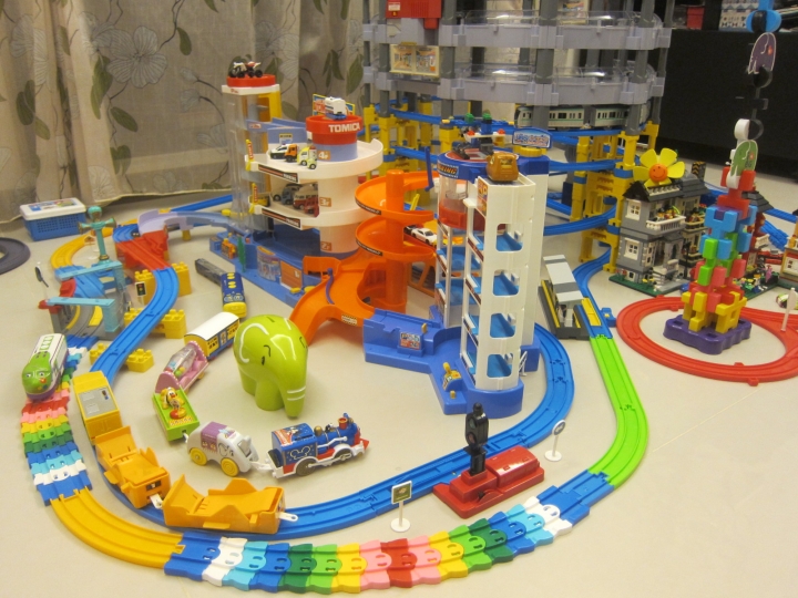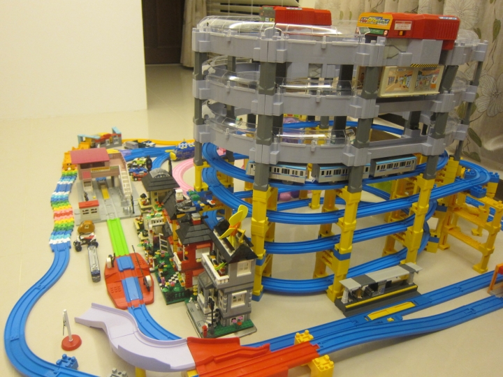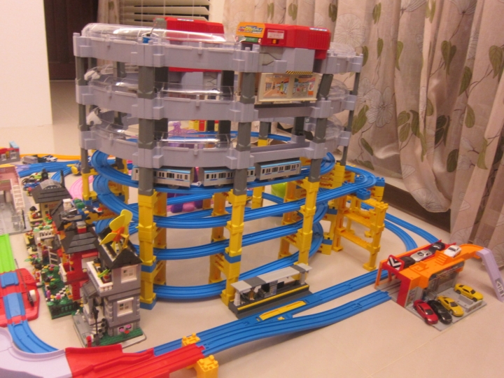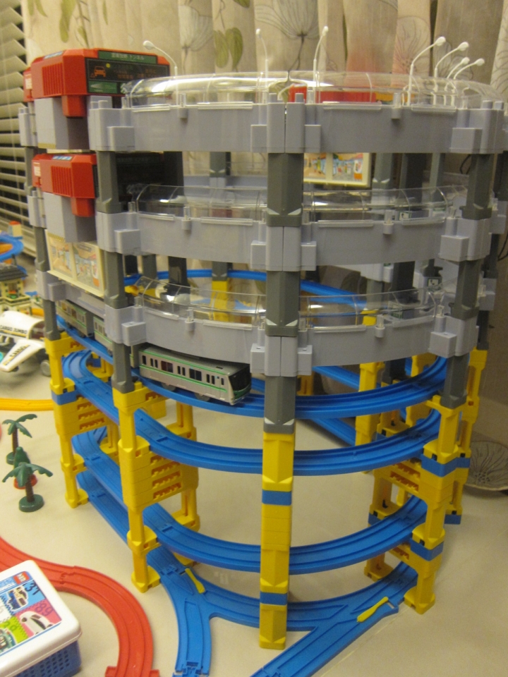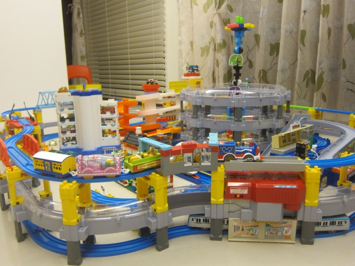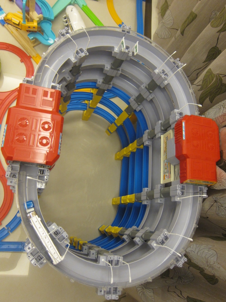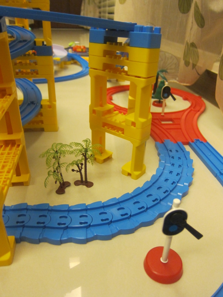 勾起我的回憶以前我買了一大堆藍色軌道和黃色支架常常組給孩子們玩軌道架3、4層,火車可以一路往上繞,再繞下來,很有意思可是組好沒多久,兒子就扮怪獸全部破壞掉孩子長大後就收起來沒再玩了回去找看看還在不在好像也有拍影片,找找看