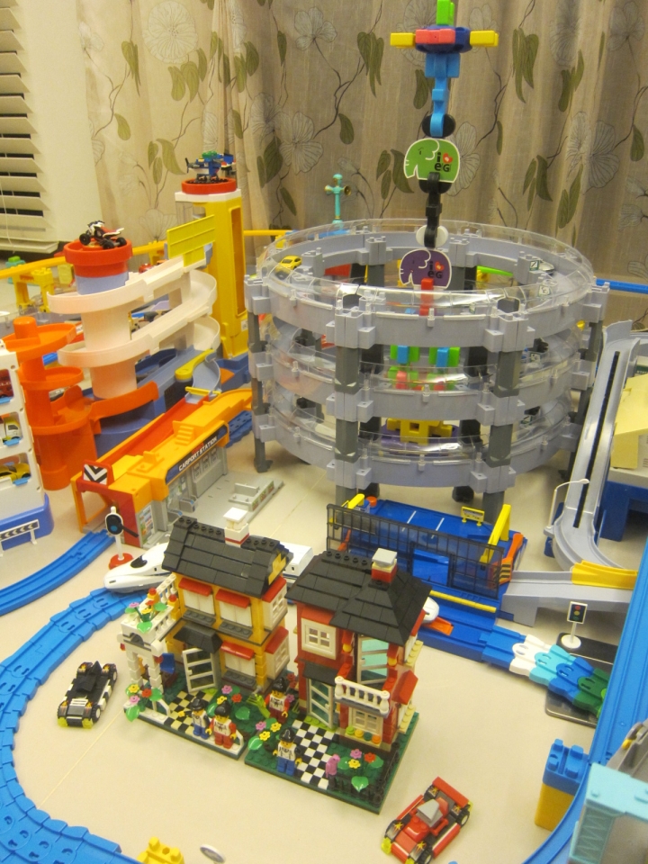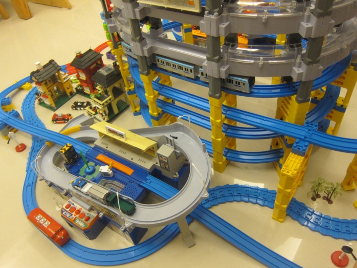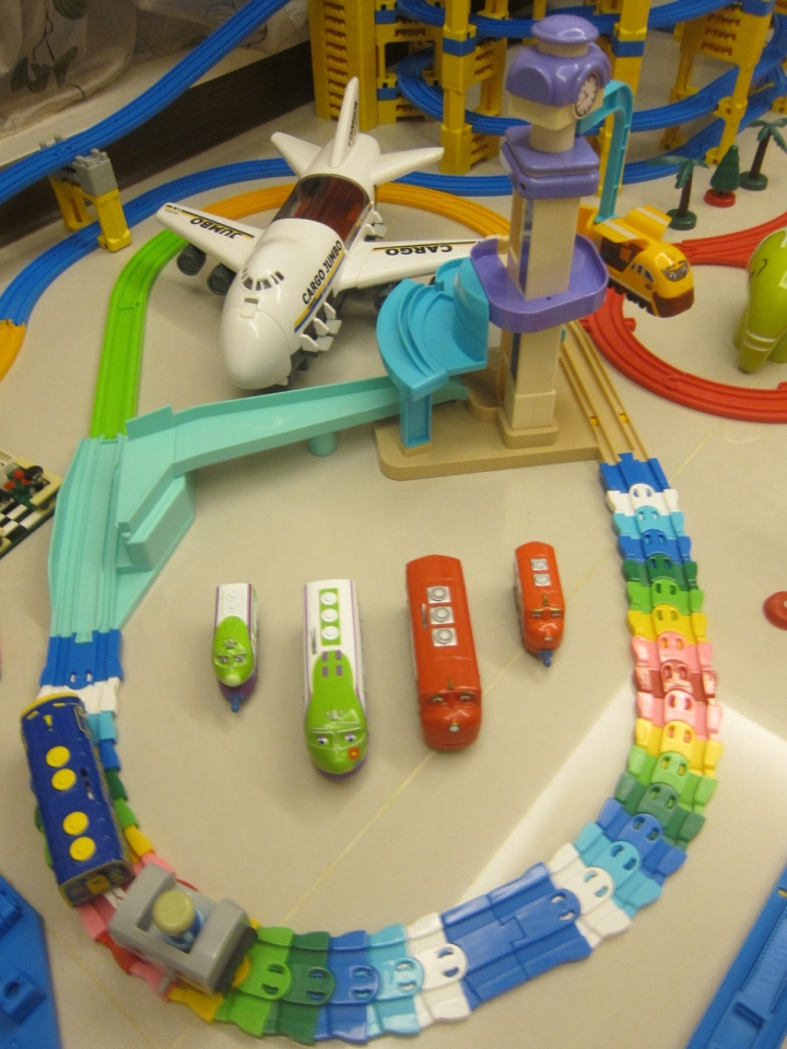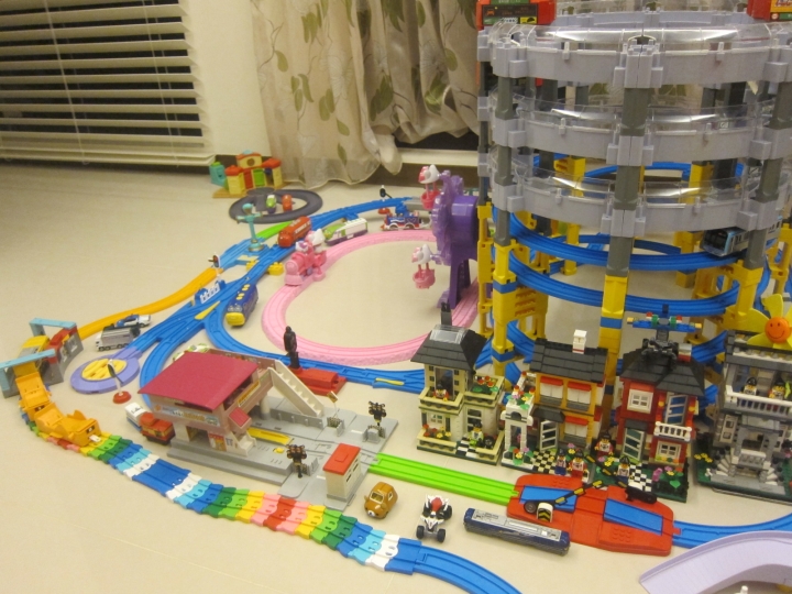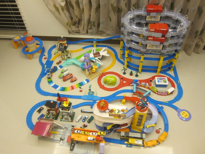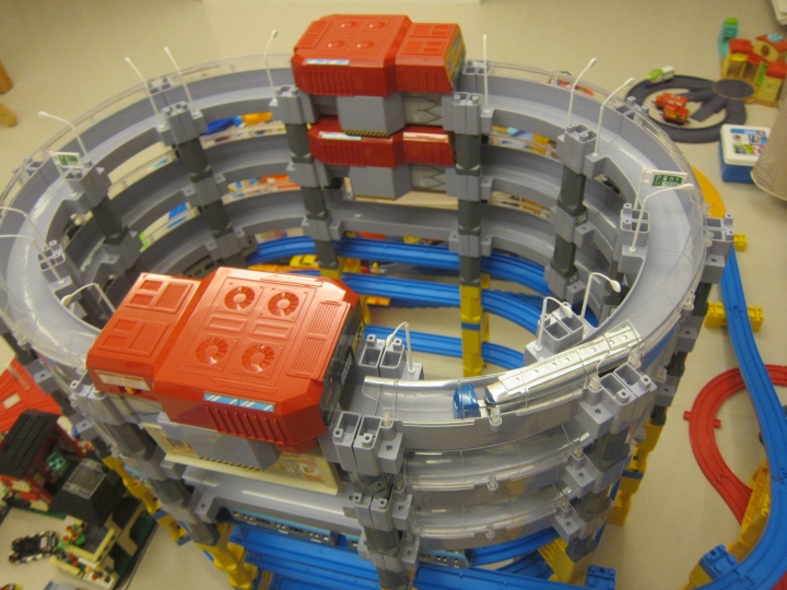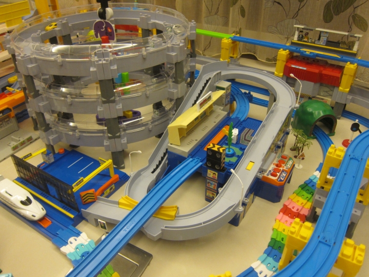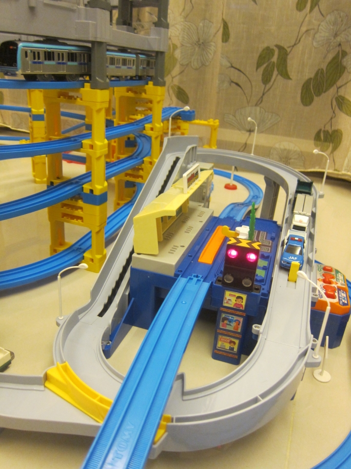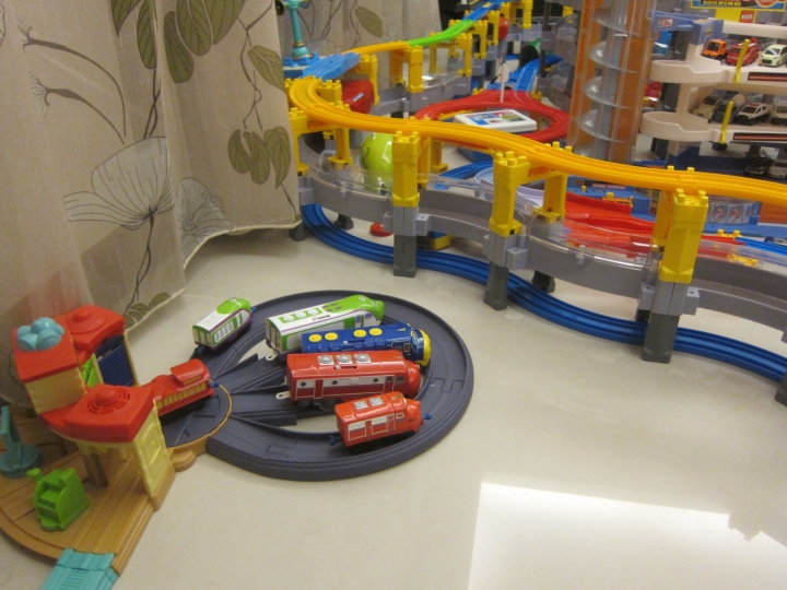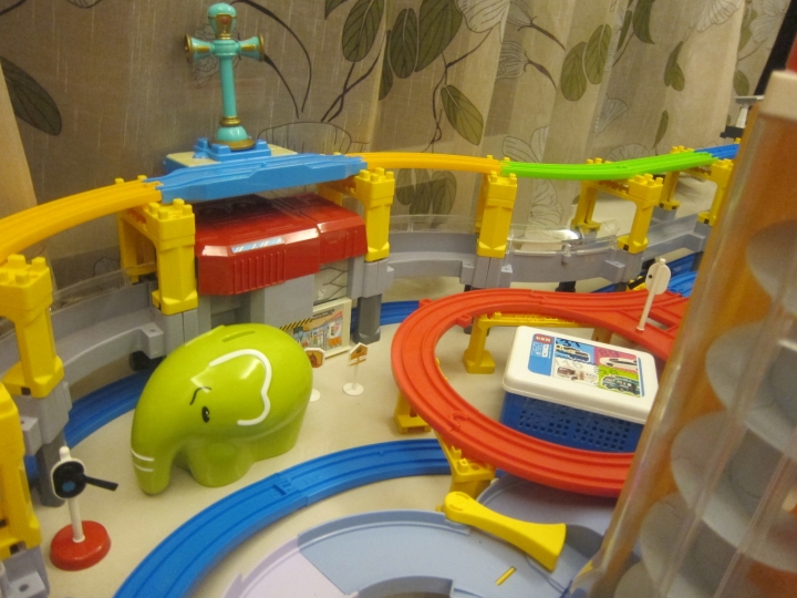 勾起我的回憶以前我買了一大堆藍色軌道和黃色支架常常組給孩子們玩軌道架3、4層,火車可以一路往上繞,再繞下來,很有意思可是組好沒多久,兒子就扮怪獸全部破壞掉孩子長大後就收起來沒再玩了回去找看看還在不在好像也有拍影片,找找看
