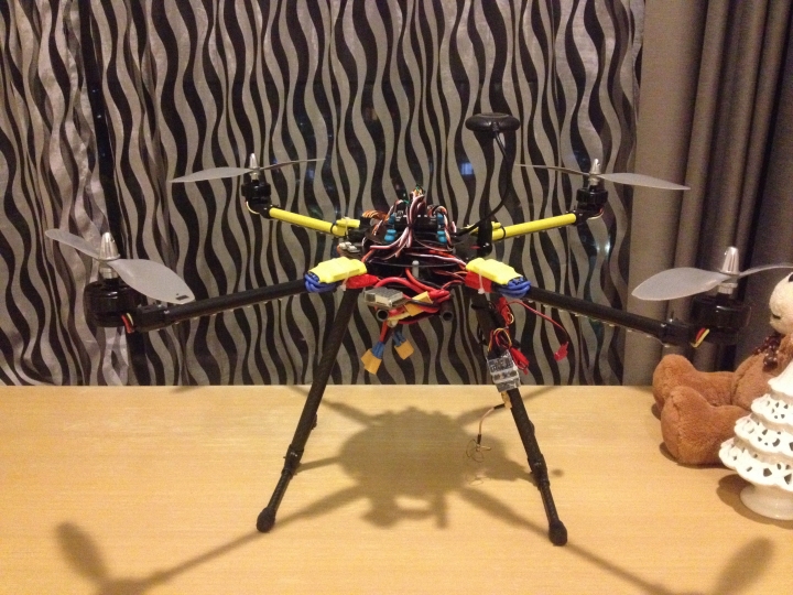 最近又組了一台六軸,使用650機架與APM 2.6 飛控板,電池還是用11.1V 2200mah X 2顆 ,槳是用1047 , 馬達是680KV , 昨天第一次試飛完成,只是電池只能飛6分多鐘,看來槳要再加大試試或並3顆電池試試