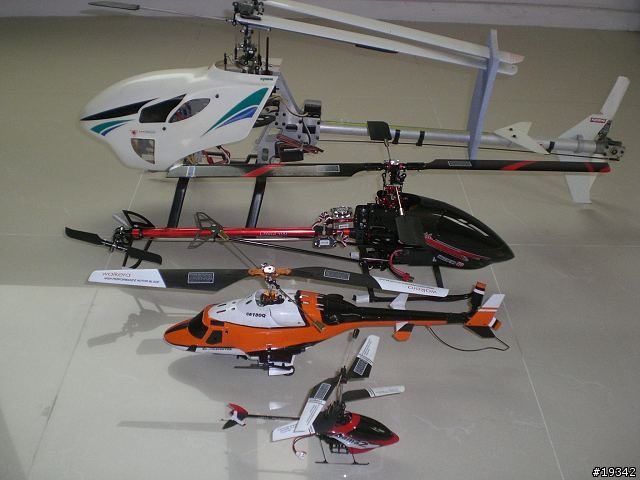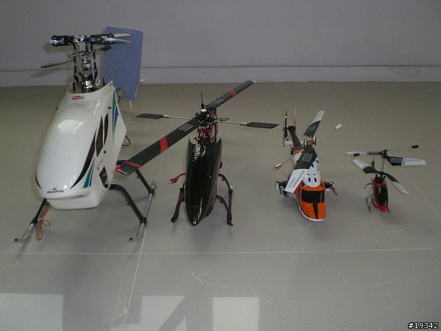 最上方是日本TSK的QUICK15,原先是15級引擎直昇機,我改為500級電動無刷馬達,使用14.8V2200MA電池,40A電子變速器,FUTABA GY401壓電鎖頭陀螺儀,發射機用JR3810,接收機用JR S649,伺服機用JR 4301*3。