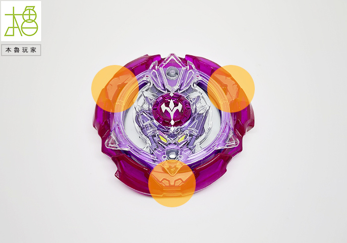 重量是蠻重的,上圖橘色圓圈的部分,是橡膠材質,沒有用指甲去壓會以為是塑膠,因為感覺不太像,這個塑膠導致緩衝強化了不少,當受到衝擊橡膠的撞擊點會將轉移到另一個方向,外圈的設計又可以做吸收用,是有雙重能力的陀螺。