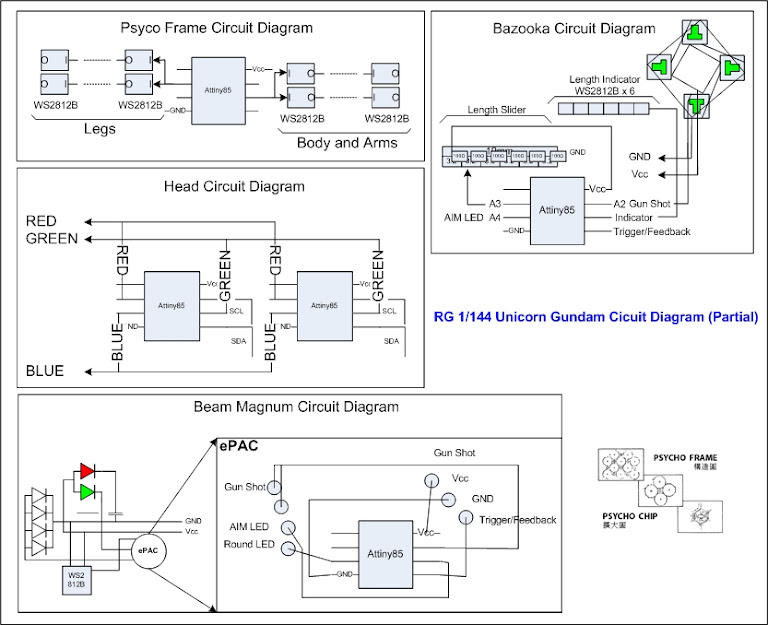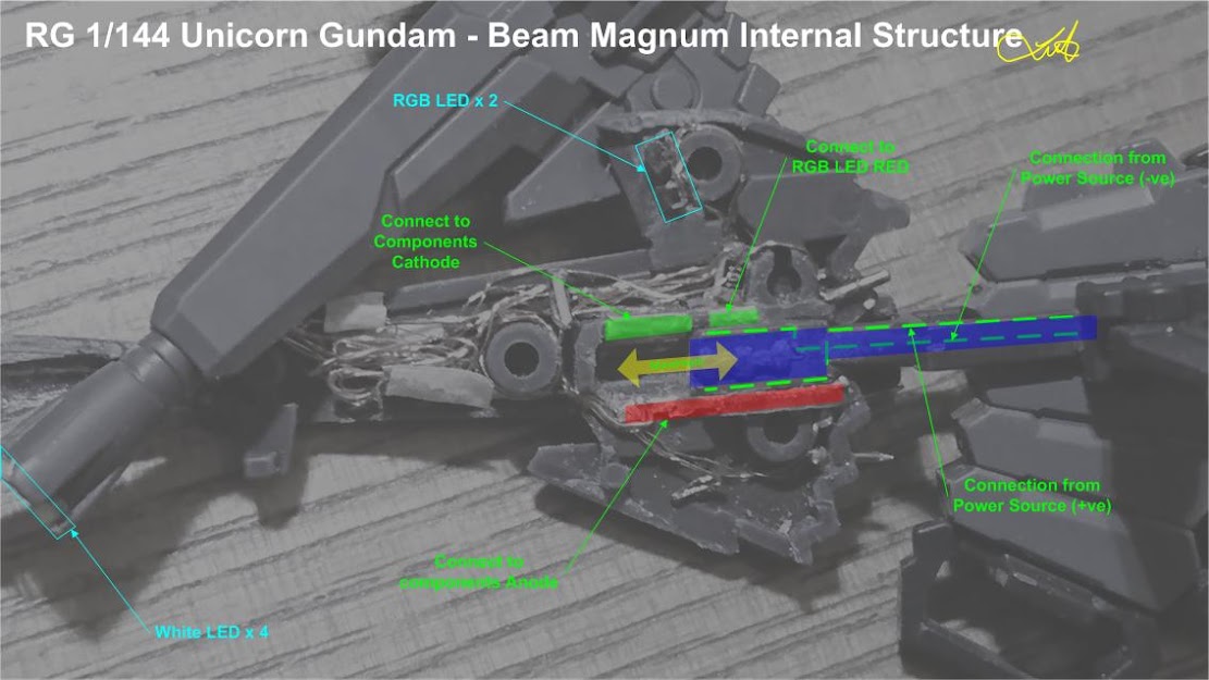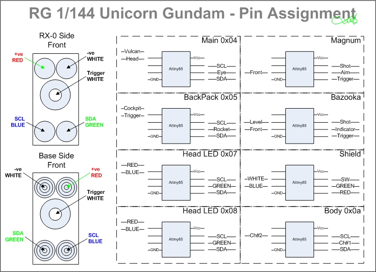 - A 3 ways connector to Unicorn Gundam Backpack for power source and fire trigger control