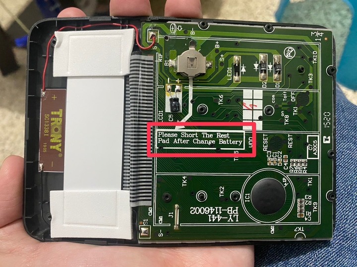 家裡的計算機壞了,拆開後,看電池的電壓只有1.3V左右,就買了顆電池換。剛換的時候,的確有恢復正常,但好像不會自動關掉,就放著等,畫面熄滅時,以為是機器自己關了,就再按ON的鍵,卻完全沒動作,再拆開把電池拆下再裝上,還是完全沒反應。在想說是不是因為電路板上有寫的reset動作沒做!?但又不知道要怎樣reset。電路板上的rest標示如照片。請問版上的大大有沒有人知道?先謝謝囉!