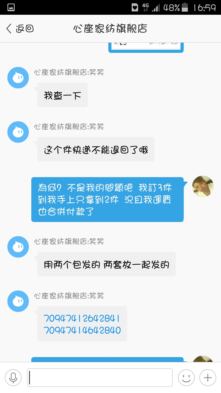 結果店家說因為有限重 所以有兩個包裹 運輸有限重 所以不一定會同時到貨 因為我運費已經付款了 所以我也沒想很多 結果等了一天 二天 我又去問店家