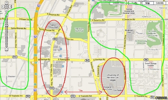 奉上vegas地圖一張, 那條長街是strip, 大賭場都在上面, UNLV才離他多遠? 其他綠色部分都是有住家的.....